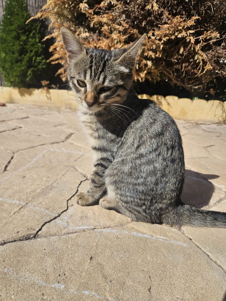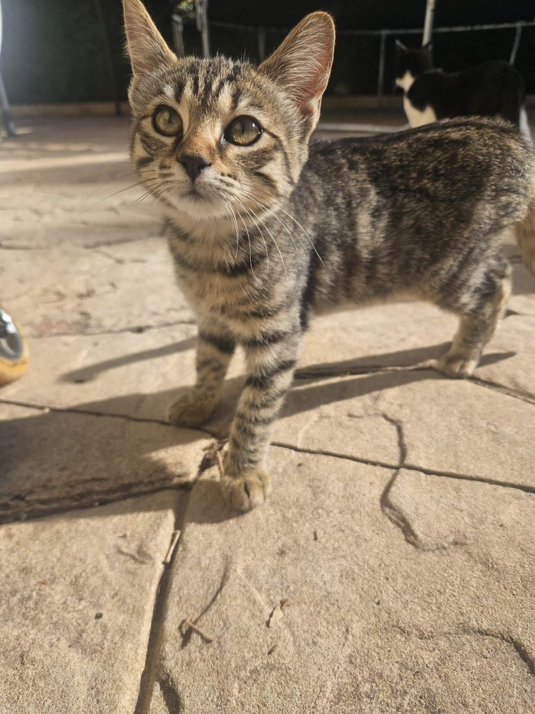 Precioso gatito tabby, aún tímido por estar recién rescatado de la calle junto a su madre y hermanos en Loranca de Tajuña.