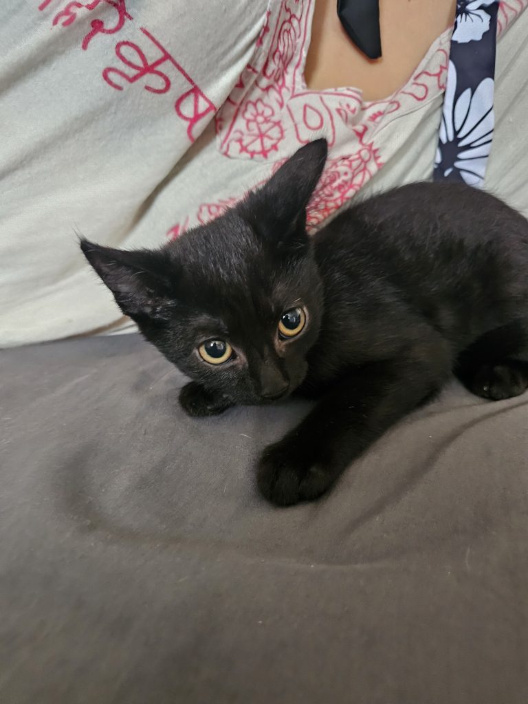 Azrael apareció recientemente junto a sus hermanos y su madre, metidos en una caja de cartón, abandonados. Es un gatito precioso, negro como el azabache, de tremendos ojos amarillos grandes como dos soles.
