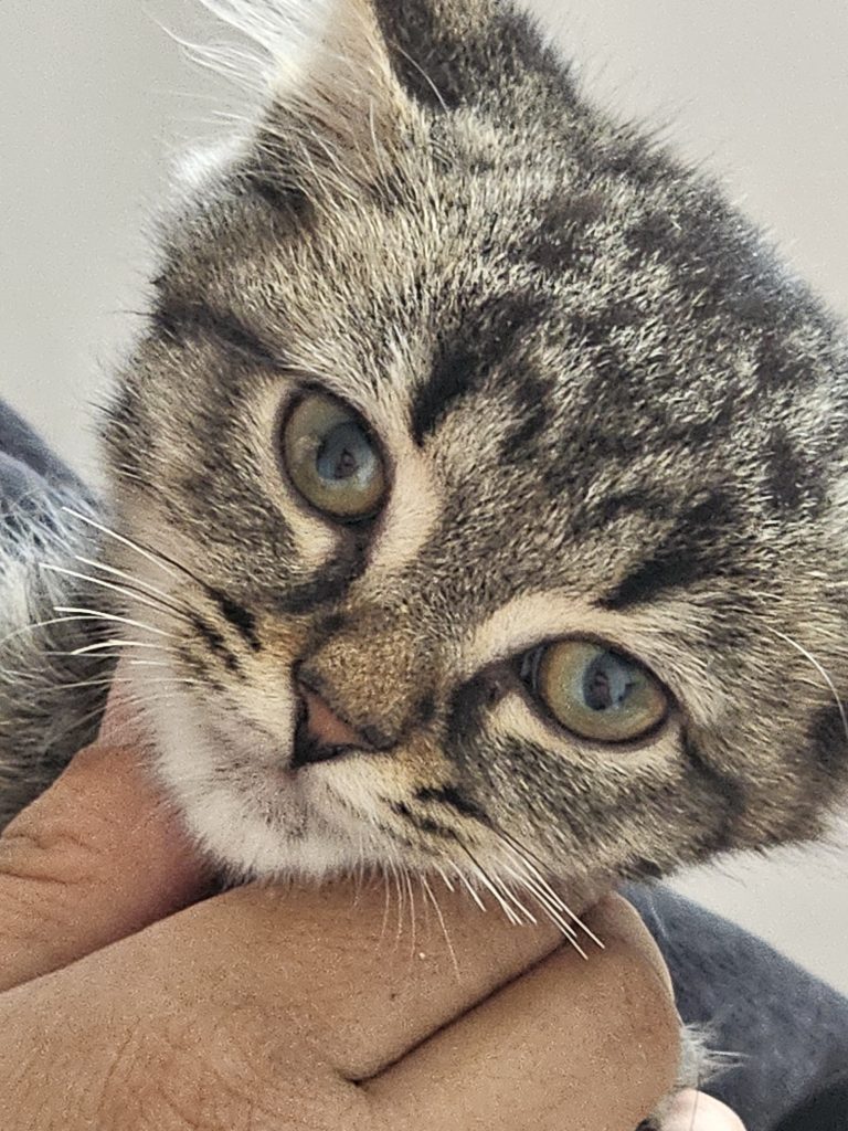Gatito encontrado en una caja de cartón junto a su madre y sus hermanos, todos abandonados.