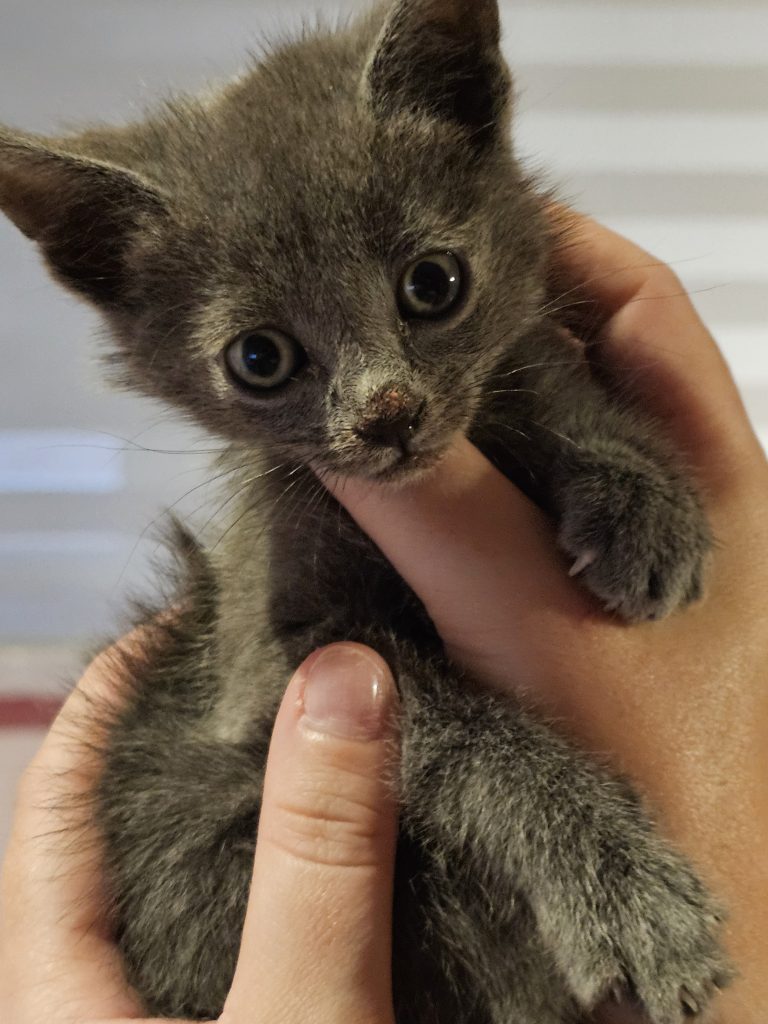 Estrella llegó a nosotros de manera casual, visitando una colonia felina fuera de control para ser censada. Se rescató a 4 gatitos, en muy malas condiciones. El hermano de Estrella falleció casi inmediatamente sin que pudiéramos hacer nada por él. Estrella sufre de un peso muy bajo desde el principio, y hace algunos días enfermó gravemente siendo ingresada. Actualmente se encuentra en una clínica de referencia en Madrid, donde su veterinaria se ha enamorado de ella y ha decidido adoptarla y luchar todo lo que haga falta para sacarla adelante. Gracias M.